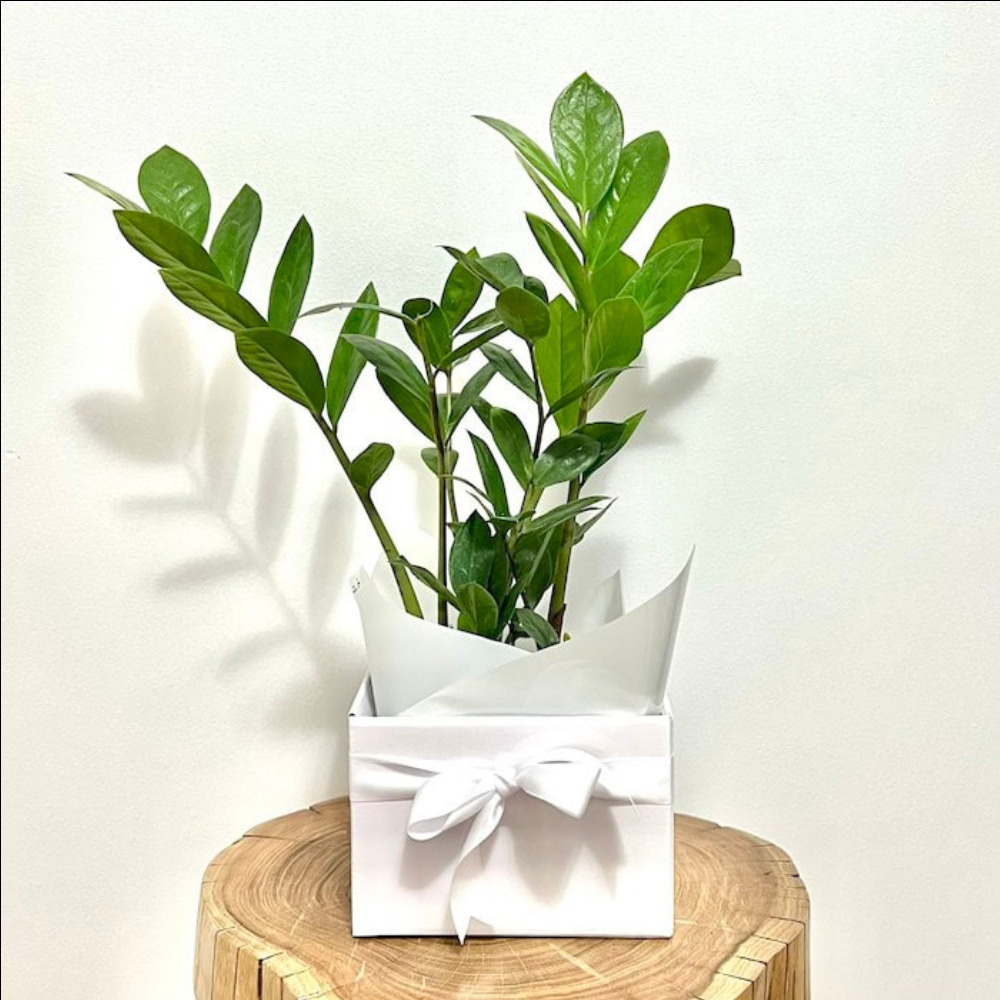Glossy, deep green Waxy leaves. Zanzibar thrives on neglect. Comes in a ceramic container.